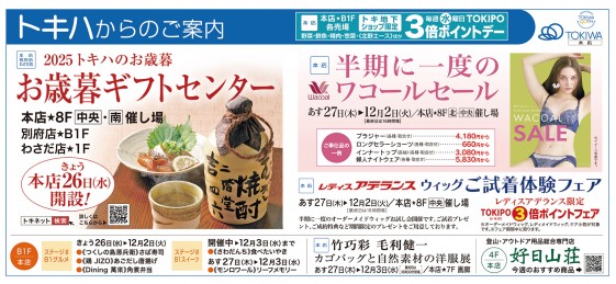 <特集:秋冬はトラッドスタイル>ブルーレーベル・クレストブリッジ トキハ本店2階ストレッチタフタ リバーシブルダウンコート 77,000円ツイードドッキングドレス 44,000円ニューヨーカー トキハ本店2階ラムウールモッサ ピーコート 53,900円エターミンニューヨーカータータン プリーツスカート 36,300円特設会場 トキハ本店3階100年コート POP UP 26日(水)17時まで極 KIWAMI D/B Trench_Women 264,000円スタンダード D/B Trench 147,400円婦人靴売場 トキハ本店1階リーガル ロングブーツ 48,400円リーガル ショートブーツ 33,000円ビューフォート ニットショートブーツ 22,000円クラークス バイカーブーツ 27,500円<特集:トキめきグルメ>RF1 トキハ本店地下1階徳島県産れんこんと長芋のイタリアンサラダ 100g 496円