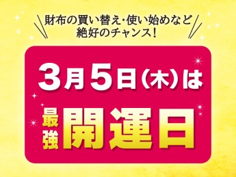 ■わさだタウン2街区1F/中央通り6丁目 財布売場3月5日(木)は「最強開運日」です。財布の買い替え・使い始めなど絶好のチャンス!【天赦日(てんしゃにち)】「天が万物の罪を赦す(許す)日。」年に5回または6回ほどしかない貴重な大吉日。【一粒万倍日(いちりゅうまんばいび)】「一粒の籾(もみ)が万倍もの稲穂になる」とされ、物事を始めるのに良いと言われています。【寅の日(とらのひ)】一瞬で千里の道を駆け、一瞬で戻って来れることからお金が出ていっても戻る日と言われています。【大安(たいあん)】購入するに良し、手に入れるに良し、事始(使い始め)に良し。何事においても吉。成功しないことはない日とされています。