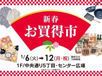 ■わさだタウン2街区1F/中央通り5丁目 センター広場■1月6日(火) ▶︎ 1月12日(月・祝) ※最終日は18時閉場センター広場にて「新春 お買得市」を開催!調味料などの食品や、生活雑貨などを特別価格にて取り揃えております。この機会にぜひお越しください。~商品の一例~ ※すべてイメージ写真です。▲〈アイテム一例〉●調味料 ●インスタント食品 ●コーヒー ●飲料 ●菓子類 ほか▲キッチン用品・フライパン・鍋ほか…特別価格▲タオル・マット…特別価格▲婦人・紳士パジャマ…2,200円から▲インドギャべマット(約40×40cm、色柄取合せ)… 30枚限り 4,400円