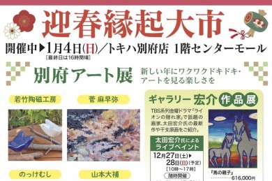 トキハ別府店では26日(金)より迎春を格調高く演出する芸術作品を集め「別府アート展」を開催します。大田宏介氏によるライブペイント&原画販売をはじめ、県内で活躍するアーティストの作品を展示。また福井県鯖江市から職人が作る色とりどりの雑貨をとりよせ、販売いたします。恒例の縁起春財布市も開催。迎春の雰囲気満載のトキハ別府店センターモールへぜひお越しください。■12月26日(金)〜1月4日(日) ※最終日は16時閉場■別府店1階 センターモール