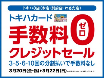 \トキハカード手数料ゼロクレジットセール/■ 3月20日(金・祝)~22日(日)■トキハ本店・別府店・わさだ店期間中、トキハカード・トキハカスタマーカードをご使用してお買物いただくと、「3・5・6・10回払いで、手数料が0円になります!」おトクな期間となっておりますので、ぜひご利用ください!(例)「税込10,000円」の商品を「6回払い」でご購入いただいた場合 初回 1,700円 2回 1,660円 : 6回 1,660円 計10,000円※一回のお支払い金額が1,000円(税込)以上が対象です。※手数料はトキハが負担いたします。\こちらも同時開催/