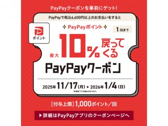 2025/11/17(月)~2026/1/4(日)までの期間、QRコード決済アプリ「PayPay」にて発行のZoffクーポンを取得し対象店舗でご購入時にPayPay支払いをご利用いただいた方に、購入金額の最大10%相当のPayPayポイントをプレゼント。メガネやサングラスの購入でポイントをゲットできるチャンス!※年末年始の休業は施設に準じます。【PayPayクーポンについて】・期間:2025/11/17(月)~2026/1/4(日)・対象:税込6,600円以上購入・上限:1,000ポイント(1万円決済分まで)・回数:1回限り※クーポン付与総額が所定の金額に達した場合、期間前に終了する場合がございます。【クーポンの取得はこちら】URL:https://s.paypay.ne.jp/8HEEar