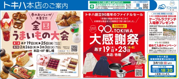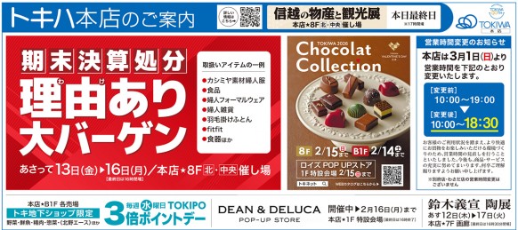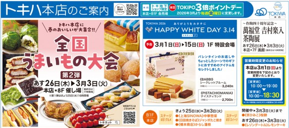 <特集:新生活に揃えたいアイテム>アフタヌーンティー・リビング(トキハ会館2階)無重力リュック plus(s) 14,850円アフタヌーンティー・リビング(トキハ会館2階)無重力ファンクションリュック(M) 15,950円アフタヌーンティー・リビング(トキハ会館2階)カードコインケース 4,180円アフタヌーンティー・リビング(トキハ会館2階)小判型ランチボックス 2,640円アフタヌーンティー・リビング(トキハ会館2階)イニシャルステンレスタンブラー 3,300円ニューヨーカー(2階)ジャケット 39,600円、シャツ 18,700円、Aラインスカート 18,700円ニューヨーカー(2階)テーパードパンツ 22,000円REGAL(2階)パンプス(ヒールの高さ3.5cm/消音ヒール) 20,900円UNTITLED(2階)バックラッフルジレ 31,900円セレモニー2WAYボウタイブラウス 22,000円ストレッチテーパードパンツ 20,900円23区(2階)ジオリカジャケット 49,940円トリアセダブルジョーゼット 2WAYレース襟 ペプラムブラウス 24,970円トリアセダブルジョーゼット パンツ 23,100円<特集:トキめきグルメ>久右衛門(地下1階)本格和風だし 最中お吸物詰合せ 9個入 3,240円