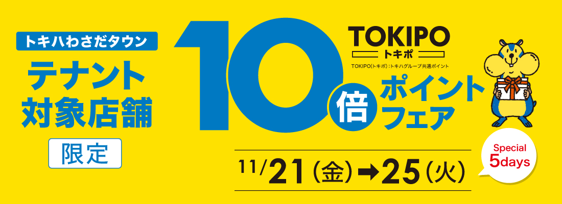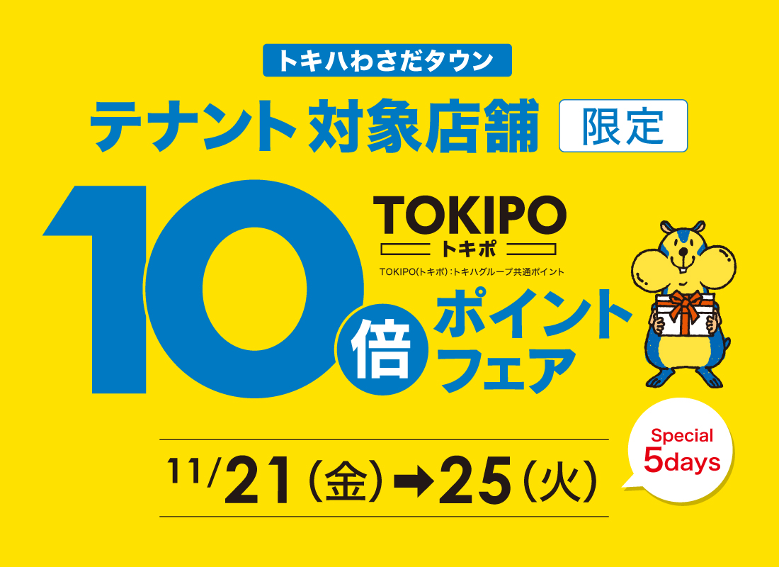 \TOKIPO(トキポ)3倍ポイントフェア/■ 11/22(土) ~ 11/24(月・振) 3日間限り■ トキハ本店・別府店・わさだ店期間中、TOKIPO(トキポ)カードを提示してお買物いただくと、通常の3倍ポイントが付いてきます!おトクな期間となっておりますので、ぜひご利用ください!※食品・飲食・レストラン・セール品はポイントアップの対象外です。※TOKIPO(トキポ)カード:トキハカード、双葉会会員証カード、現金ポイントカード「RUCCHA!(ルッチャ)」\こちらも同時開催/
