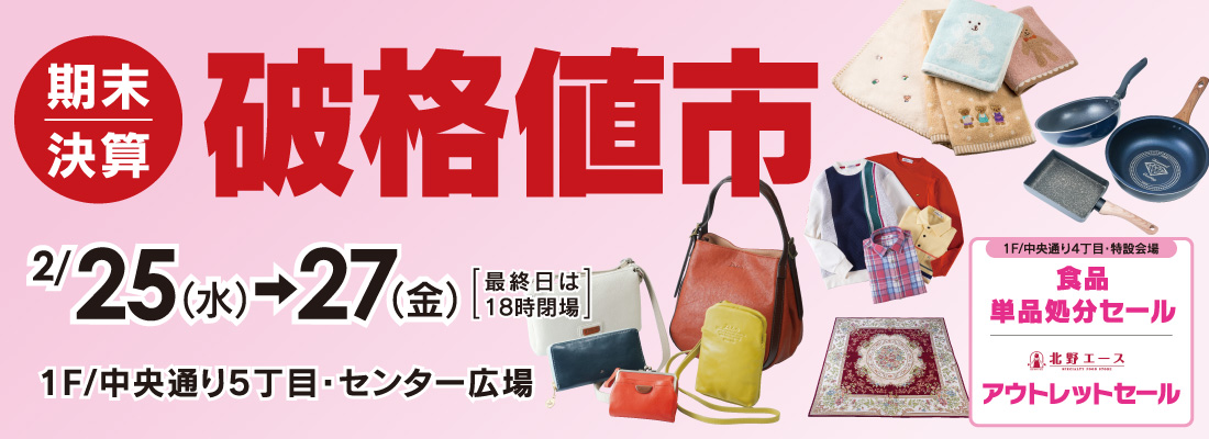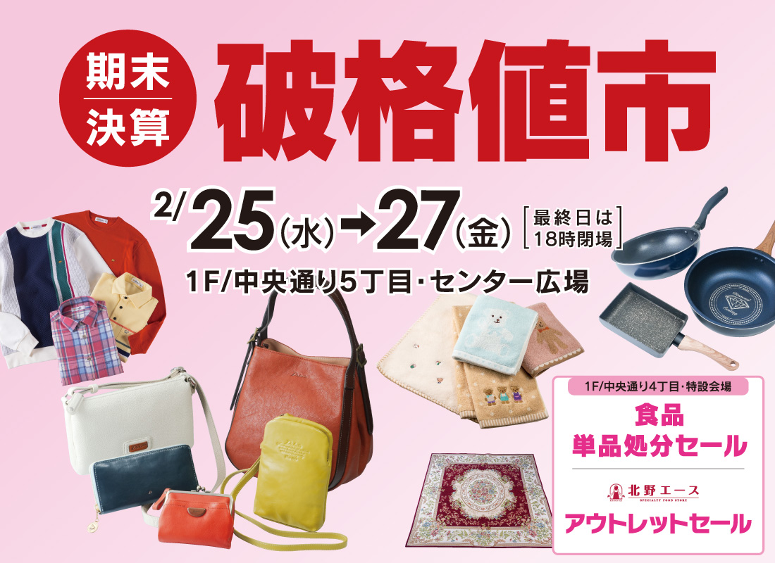 ■わさだタウン2街区1F/中央通り5丁目 センター広場■2月25日(水) ▶ 2月27日(金) ※最終日は18時閉場センター広場にて「期末決算 破格値市」を開催!婦人雑貨や生活雑貨など、特別価格にて取り揃えております。また、特設会場にて「食品単品処分セール・《北野エース》アウトレットセール」も開催!各売場でも同時開催しておりますので、この機会にぜひお越しください。<商品の一例> ※すべてイメージ写真です。▲《ダコタ》財布・ハンドバッグ(デザイン各種)…特別価格婦人スニーカーほか(デザイン各種・サイズ取合わせ)…5,500円から▲《ゴールデンベア》紳士服(デザイン各種)…特別価格▲婦人ベスト(デザイン各種)…3,300円から婦人ジャケット(デザイン各種)…5,500円から▲タオル・マット…特別価格▲キッチン用品(鍋・フライパンほか)…特別価格▲ゴブラン織カーペット(約200×200cm)…5本限り 19,800円▲ランドセル(デザイン各種)…22,000円から