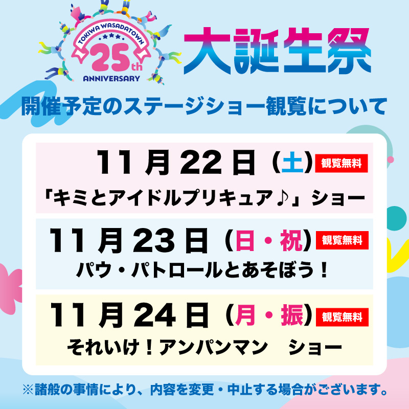 【開催日】11月22日(土)【時 間】①11:30~ ②14:00~【場 所】フェスタ広場 雨天中止・観覧無料 ※観覧人数を制限させていただきます。イベント当日10:00~会場前にて入場整理券を配布します。※1回30分程度のショーです。※ショー終了後にお見送りを実施します。立ち止まっての撮影はできません。※天候等により、急遽、観覧条件や内容の変更、または中止になる場合がございます。※整理券がなくなり次第、受付は終了となります。▼入場整理券について※会場への入場の際、入場整理券が必要です。※イベント当日朝10:00よりフェスタ広場前にて入場整理券を配布します。※全席指定で入替制の椅子席となります。お子様も1脚ずつお座りください。一人で座れない小さなお子様は大人の膝の上にのせてご観覧ください。手荷物は最小限にして、椅子の下、または足元に置いてください。一部、2F回廊・3F回廊のお席もございます。※入場整理券はお一人様につき、いずれかの回のご家族の人数分最大5名分までお渡しします。別の回の観覧もご希望される場合は、再度最後尾にお並びください。※お友達等ご家族以外の方の分に関して入場整理券をお渡しすることはできません。※入場整理券には席の番号を記載しており、お渡しする順番に前列より詰めてご案内いたします。※席の位置に関してのご希望、また、席の変更は一切受け付けられません。ご了承ください。※フェスタ広場(1F)分の配布終了後、2Fの回廊、3Fの回廊の順で配布します。※1回目公演分の配布が終了後、2回目公演分を配布します。※入場整理券の交換・譲渡・販売はできません。※入場整理券配布が終了した時点で受付は終了となります。▼会場注意事項※全席指定で入替制の椅子席となります。椅子以外のエリアに場所を取ることはできません。フェスタ広場(1F)の会場は必ず椅子に座ってご観覧ください。2F・3Fの回廊席は、椅子の前に立って、またはお子様を抱いての観覧は構いませんが、お子様を椅子の上に立たせたり、手すりの上に乗せることは大変危険ですのでおやめください。※安全確保の観点から、椅子の間隔をとって並べております。また、避難路を確保しておりますので、椅子の位置は動かさないでください。※体調のすぐれない方は、入場をご遠慮ください。※ベビーカーの会場内への持ち込みはご遠慮ください。会場後方にベビーカー置場(テント)をご用意いたします。紛失・盗難等の責任は負いかねますので、貴重品は必ずお手元にお持ちください。※手荷物・レジャーシート・その他を使用しての場所取り行為は、全てのエリアで禁止といたします。発見次第、スタッフ及び警備員により随時撤去させていただきます。※開場は各回ともに、ショー開始30分前を予定しております。※入場後は原則会場外には出られません。急用の場合は、入場整理券を必ずお持ちになり、スタッフにご提示ください。※会場は屋外です。急な雨天の場合、傘を使用してのご観覧はできません。レインコート等の雨具を各自でご用意ください。※他の方の観覧の妨げとなるため、公演中のつばの広い帽子や日傘・雨傘の使用はご遠慮ください。※ショー公演中の写真・動画の撮影は【禁止】とさせていただきます。撮影可能なタイミングはMCよりご案内いたします。開始と終了の合図に従って撮影いただくよう、お願い申し上げます。撮影タイムでの撮影は構いませんが、SNSへのアップロードや他人への送付は禁止します。また、画像・動画に他のお客様が映らないよう細心の注意をお願いします。※会場内の飲食は禁止です。水分補給は構いません。※会場および施設内は原則禁煙です。喫煙所でのみ喫煙可能です。※一般のお客様が多く通行される場所となりますので、通路確保にご協力をお願いします。▼最後に※天候等により、急遽、観覧条件や内容の変更、または中止になる場合がございますので、イベント前日、また、直前にもう一度、トキハわさだタウンHPにてご確認ください。※以上すべて皆様が安全にご観覧いただくためのお願いです。守っていただけない方がいた場合、イベントを中止する事がございます。予めご了承ください。2025.11.17