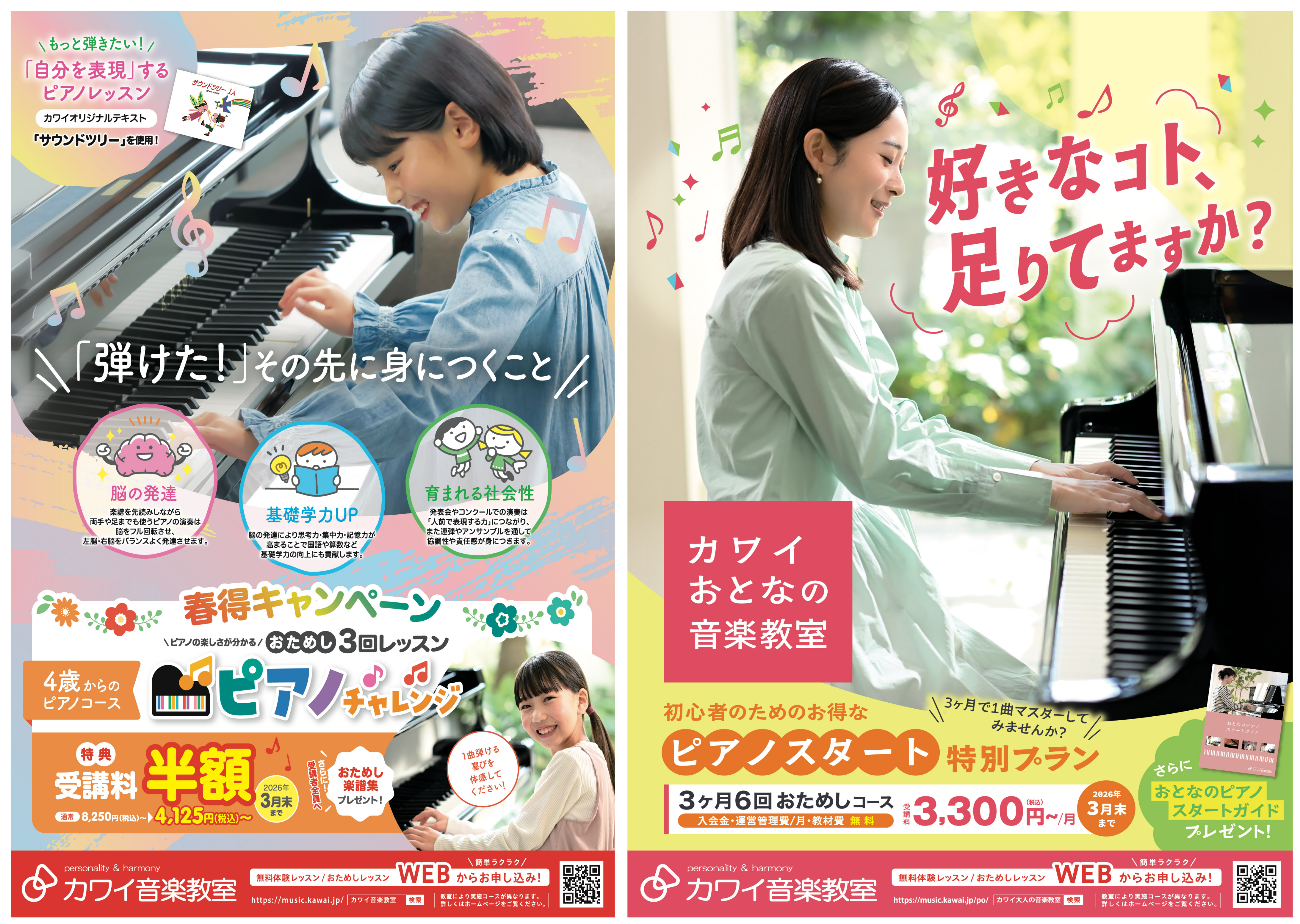 【春得キャンペーン】 こんにちは♪カワイ音楽教室です。 新春・・・新しいことに挑戦するのにぴったりの季節です! 習い事の中でも人気トップの「ピアノ」、春から はじめてみませんか?無料体験・おためしレッスン受付中です♪ ☆おためし3回レッスン ピアノチャレンジ ≪2026年3月末まで≫ ~今大人気!1か月で簡単な曲が弾けるように・・・“はじめてのお子様”のための3回個人レッスン~ お子様がピアノに興味を持つか不安・・・まずは、おためし個人レッスンから初めてみませんか?1か月間のおためし3回レッスンにより、お子様がピアノを続けていけるかを判断できます。 60年以上のノウハウを詰め込んだオリジナルテキスト「サウンドツリー」でお子様の成長にとって「何が必要か」を常に考えたレッスンを行います。 【受講料半額】受講料通常8,250円(税込)→4,125円(税込) 【おためしレッスン終了後、正規ご入会で入会金半額】通常入会金5,500円~11,000円(税込) ☆3歳ソルフェージュ ≪2026年3月末まで≫ 3歳からピアノを始めたい方へ!初歩のピアノレッスンで音楽的な基礎を楽しく身につ けます! 【ご入会の方限定、入会金半額】通常入会金 5,500円~11,000円(税込) ☆大人ピアノスタート特別プラン≪2026年3月末まで≫ 3か月で1曲マスターしてみませんか?3か月6回のお得なおためしレッスンです 【受講料】3,300円(税込)/月 【運営管理費】 無料/月 【おためしレッスン終了後、正規ご入会金無料】 受講者の方全員に「おとなのピアノスタートガイド」をプレゼント ピアノコース以外にもバイオリンや声楽、いきいきピアノなどのグループコースも。 是非一度カワイ音楽教室HPをご覧ください。 ※無料体験・おためしレッスンの申し込みは《カワイ音楽教室》WEBなら24時間受付中。 ※教室によって実施コースが異なる場合があります。詳しくはお問い合わせください。 【お問合せ】 カワイ音楽教室 大分事務所 ℡ 0120‐74‐7009 (火曜~土曜 10時~15時)