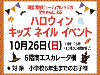 ■ 10/26(日)※11:00〜16:00(15:30受付終了)■ 6F 南エスカレータ横 特設会場明星国際ビューティビレッジの学生さんによるキッズネイルイベントを開催!お子様の爪にハロウィンをモチーフにしたネイルを施してもらえます。どうぞこの機会にお立ち寄りください。< 詳細 >・参加費:無料・開催時間:11:00〜16:00(15:30受付終了)・人数制限①:LINE予約先着 40名様・人数制限②:当日予約 30名様・対象:小学校6年生までのお子様※ご予約希望のお客様は、トキハ本店公式LINEのお友だち登録をお願いいたします。※10/18(土)に予約受付と詳細を配信いたします。