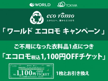 ■ 4月2日(木) ~ 6日(月)※最終日は17:00終了■ 2F 特設会場(南エスカレータ下り側)■ 受付時間:各日10:00 ~ 18:00(最終日は17:00終了)■ お一人様 9点まで(1回につき)期間中に、ご不用になった衣料品をお持ちいただくと1点につき「エコロモ1,100円(税込) OFFチケット」1枚とお引換えいたします。「エコロモ1,100円(税込) OFFチケット」は、トキハ本店のWORLDグループショップで、お買い上げ金額が5,500円(税込)毎に1枚ご利用いただけます。■ エコロモ1,100円(税込) OFFチケットご利用期間⇒2026年4月2日(木) ~ 6月7日(日)まで※店休・営業時間はトキハ本店に準ずる■ トキハ本店 対象店舗・1F:ヒロフ・2F:アンタイトル、インディヴィ・3F:リザ サロン・4F:アダバット、タケオキクチ・6F:メゾピアノ、クレードスコープ、センスオブワンダー、メゾピアノジュニア、ポンポネットジュニア、KP