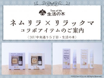 ■わさだタウン2街区3F/中央通り5丁目 生活の木天然アロマが香るフレグランスシリーズ「ネムリラ」を、より多くの睡眠環境に悩みを持つ方に取り入れていただき、自然のもので健やかに楽しい暮らしを過ごしていただきたい。 そんな想いから、「ネムリラ」と相性抜群な、いつもごゆるりとマイペースな大人気キャラクター「リラックマ」とのコラボ商品を2025年10月1日(水)より数量限定で販売いたします。※購入制限を設けさせていただきます。Hinoki キャップ(四角)とネムリラブレンドエッセンシャルオイル 5ml のセット。Hinoki キャップはラベンダーとシトラスでそれぞれ異なるデザインのリラックマが刻印されています。香りは、深みのあるフローラルなラベンダーと、華やかなベルガモットが香るシトラスの2種類。●ネムリラ Hinoki アロマキャップセット ラベンダー/シトラス…各3,300円箱とラベルにくつろぐリラックマたちが描かれた、枕に吹きかけるだけのピロースプレー。香りは深みのあるラベンダーと、落ち着きあるシトラスの2種。プレゼントにもおすすめです。●ネムリラ ピロースプレー ラベンダー/シトラス…各1,210円・・・リラックマとは・・・いつもごゆるりマイペースな着ぐるみのクマ。コリラックマやキイロイトリと一緒に、OLのカオルさんの家でお世話になり続けている。いそうろうなのに、特に役に立っているわけでもなく、毎日だらだらゴロゴロしている。リラックマの一番の関心事は、毎日のごはんとおやつらしい。
