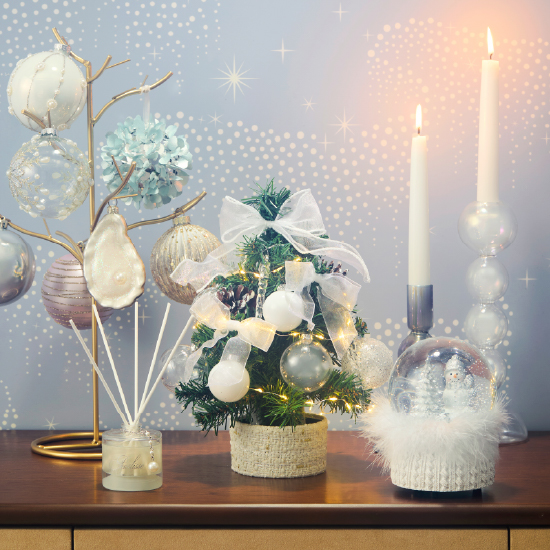 コーディネートにこだわった新しいデザインのデスクトップツリーです。大小のオーナメント付きでとっても華やか。ライトも細かくキラキラ光ります。星形のオーナメントがポイントです。