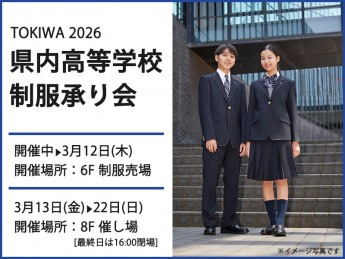 ■ 開催中 ~ 3月12日(木)■ 6F 学生服売場■ 3月13日(金) ~ 3月22日(日)※最終日は16:00採寸最終受付■ 8F 催し場<ご来場のお客様へのお願い>・8階催し場では、採寸されるお客様での混雑が予想されるため、お待たせする場合がございます。・閉店時間前は各日大変混み合いますので、採寸をご希望のお客様はお早めに会場へお越しください。※3月より営業時間が18:30閉店へ変更となりました。・早期ご予約をいただいた新入学生のお客様につきましては、商品のお受取りは3月23日(月)以降に6F 学生服売場へご来店願います。・取扱い高校につきましては売場まで問い合わせください。