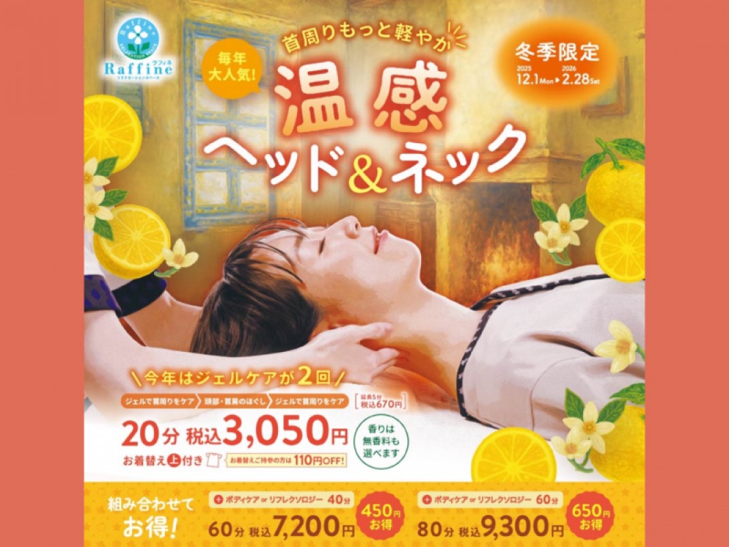 夏に大好評だった「ヘッド&ネック」が冬verとして登場!温感成分配合のジェルで、首元のリンパを流し、肩・首・頭をもみほぐして、終わった後は、ぽかぽか温まります。