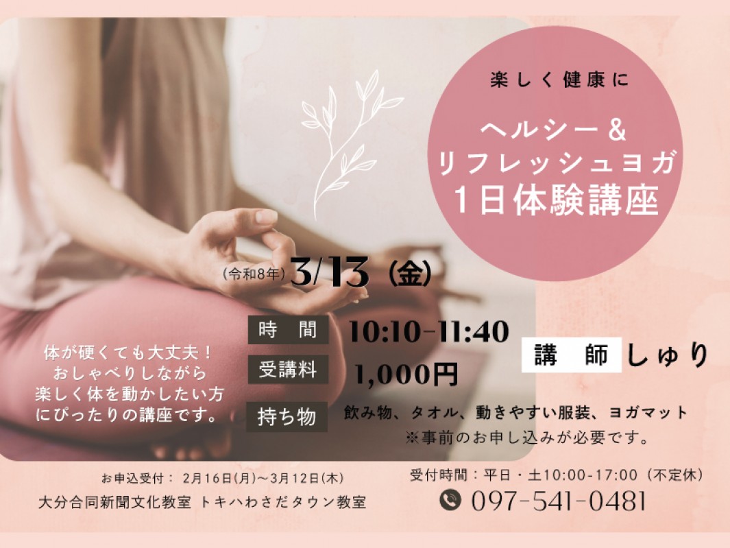 運動不足の方や初めての方も安心して参加できる、安全でムリのないヨガです。呼吸とやさしい動きを大切にし、体幹トレーニングで姿勢を整えながら、徐々に体が楽になる変化を一緒に感じていきましょう。