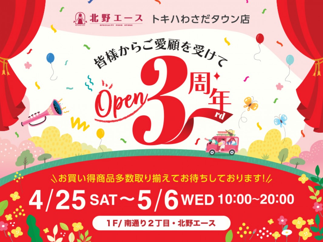 北野エースにて、オープン3周年を記念して特別セールを開催しております!